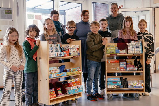 Wie jeden Montag hatten sich alle Schülerinnen und Schüler des Standortes Bunsoh der Wulf-Isebrand-Schule mit ihren Lehrkräften in der Eingangshalle versammelt. Dieses Mal wartete jedoch eine besondere Überraschung auf die Kinder. Birte Claußen, Lea Blenke und Amelie Blohm übergaben ihnen stellvertretend für den Förderkreis zwei rollbare Regale. Diese waren neben einigen bekannten Spielen mit vielen neuen Spielen bestückt. Die Spiele, welche angepasst an die Pausen alle eine kurze Spieldauer haben, sollen in erster Linie die Langeweile in den Regenpausen verhindern. Die Freude der Kinder war groß. Und auch wenn an diesem Tag die Sonne schien und keinerlei Regenwolken in Sicht waren, durften die neuen Spiele sogleich ausprobiert werden.